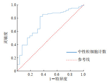 ROC曲线(图 1)分析结果表明,中性粒细胞计数对产科脓毒性休克的发生有预测价值(AUC=0.741,95%CI 0.634~0.848,P=0.000 2),最佳截断值为17.17×109/L。当中性粒细胞计数>17.17×109/L时,预测产科脓毒性休克发生的灵敏度为82.3%,特异度为65.4%,约登指数为0.477。