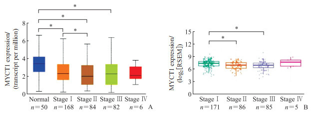 图 1 基于数据库分析HCC组织中MYCT1的表达Fig. 1 Expression of MYCT1 in HCC tissue based on databasesA: MYCT1 expression in The Cancer Genome Atlas database based on UALCAN; B: MYCT1 expression in GSCA database. **P < 0.01. HCC: Hepatocellular carcinoma; MYCT1: Myc target 1; RSEM: RNA-Seq by expectation maximization; GSCA: Gene Set Cancer Analysis.2.1.2 MYCT1表达与临床分期的关系