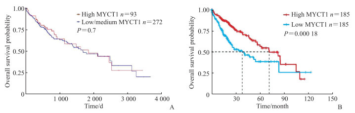 UALCAN平台分析显示,MYCT1高表达组患者的总生存期与中低表达组相比差异无统计学意义(P>0.05,图 3A);然而,基于GSCA数据库生存分析结果显示,MYCT1高表达组HCC患者的总生存期长于低表达组(P<0.001,图 3B)。上述结果提示MYCT1表达下调可能促进HCC进展。