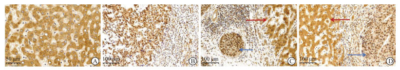 图 4 MYCT1在HCC组织中的免疫组织化学表达特征Fig. 4 Immunohistochemical expression characteristics of MYCT1 in HCC tissueA: Adjacent non-tumor tissue showing strong cytoplasmic MYCT1 positivity with weak nuclear MYCT1 staining. B: HCC tissue demonstrating intense nuclear MYCT1 positivity with attenuated cytoplasmic MYCT1 expression. C, D: The expression patterns of the matched HCC tissue (C) and adjacent non-tumor tissue (D) in the same case; the HCC tissue showed predominant nuclear MYCT1 expression (blue arrow), while the adjacent non-tumor tissue showed strong cytoplasmic MYCT1 expression (red arrow). MYCT1: Myc target 1; HCC: Hepatocellular carcinoma.2.2.2 MYCT1亚细胞定位与HCC临床病理特征的关系