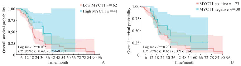 对103例HCC患者进行了系统性随访,最终92例患者完成随访(失访率10.7%,11/103),其中生存组44例,死亡组48例。Kaplan-Meier生存分析显示,HCC组织中MYCT1细胞质高表达患者的总生存期优于低表达者(P=0.035,图 5A);MYCT1细胞核阴性患者较阳性患者表现出生存优势,但差异无统计学意义(P>0.05,图 5B)。上述结果提示HCC组织中细胞质MYCT1有潜力成为预测HCC预后的标志物。