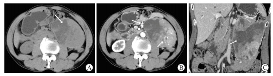 (1)病灶大小,指在增强CT静脉期横断面图像测量的病灶最大径;(2)平扫及增强动脉期和静脉期CT值、最高绝对强化CT值,避开囊变坏死、血管或钙化区域选择感兴趣区域(region of interest,ROI),测量病灶内3个ROI的CT值,取平均值,不同时相的测量部位和范围保持一致。