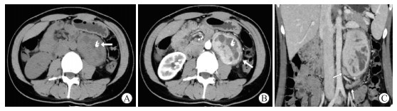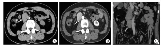 CT扫描采用日本Toshiba Acquilion One CT扫描仪和荷兰Philips Brilliance iCT仪。扫描参数:管电压120 kV,采用自动管电流技术,机架转速0.5 s/圈,螺距0.87或0.921,重建视野350 mm×350 mm,层厚5 mm,层间距5 mm。采用高压注射器经肘静脉注射非离子型碘造影剂碘海醇(上海博莱科信宜药业有限公司),碘浓度350 mg/mL,注射总量为80~100 mL,注射速率2.5~4 mL/s。分别于注射造影剂25~30 s、60~70 s、120~140 s行动脉期、静脉期及延迟期成像。