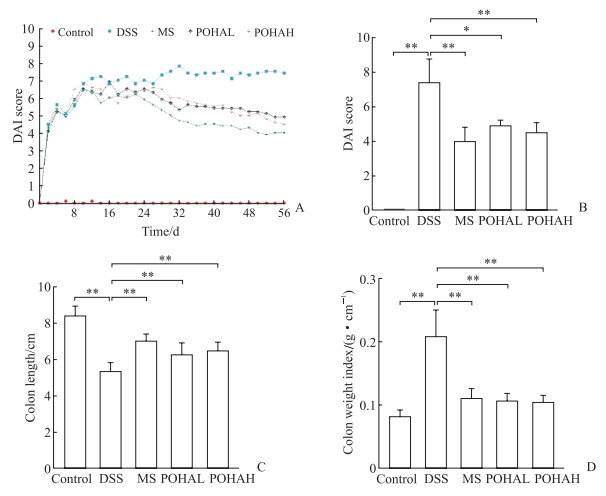 DSS诱导第1周,对照组DAI评分保持稳定。相较于对照组,DSS组、MS组、低POHA组和高POHA组DAI评分快速升高,表明急性UC诱导成功。第2周,对照组DAI评分仍保持不变,DSS组DAI评分持续增加至7分以上,MS组、低POHA组、高POHA组DAI评分稳定在5~7分。第3~8周,对照组DAI评分均为0分,DSS组DAI评分稳定在7~8分,提示慢性UC诱导成功。相较于DSS组,MS组、低POHA组、高POHA组DAI评分均降低,其中MS组降低最多(图 1A)。造模结束时,DSS组DAI评分较对照组增高(P<0.01),MS组、低POHA组、高POHA组DAI评分均较DSS组降低(均P<0.05,图 1B)。