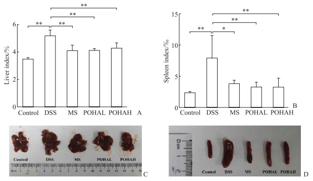 相较于对照组,DSS组小鼠肝脏指数和脾脏指数均增加(均P<0.01,图 3A、3B),肝脏和脾脏体积均增大(图 3C、3D)。相较于DSS组,MS组、低POHA组、高POHA组小鼠肝脏指数和脾脏指数均降低(P<0.05或P<0.01,图 3A、3B),肝脏和脾脏体积均减小(图 3C、3D),表明POHA和MS减轻了DSS引起的系统性炎症。