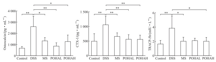 相较于对照组,DSS组小鼠血清骨钙素、CTX-1及TRACP-5b水平均增加(均P<0.01)。相较于DSS组,MS组和高POHA组小鼠血清骨钙素、CTX-1及TRACP-5b水平均降低(P<0.05或P<0.01);低POHA组小鼠血清骨钙素、CTX-1水平均降低(均P<0.01),TRACP-5b水平降低但差异无统计学意义(P>0.05)。见图 4。