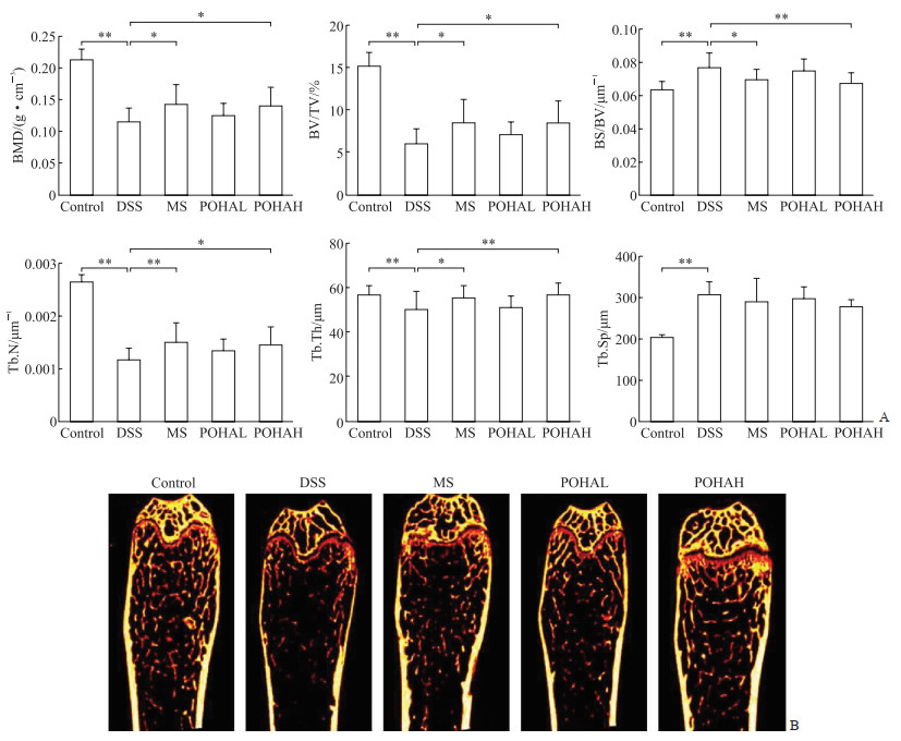 与对照组相比,DSS组小鼠股骨BMD、BV/TV、Tb.N、Tb.Th均降低(均P<0.01),BS/BV、Tb.Sp均升高(均P<0.01,图 5A)。与DSS组相比,MS组和高POHA组小鼠股骨BMD、BV/TV、Tb.N、Tb.Th均增加(P<0.05或P<0.01),BS/BV降低(P<0.05或P<0.01);MS组、低POHA组、高POHA组Tb.Sp水平与DSS组相比差异均无统计学意义(均P>0.05,图 5A)。与对照组相比,DSS组股骨骨质明显空洞,骨小梁的数量和面积减少(图 5B)。MS和高剂量POHA均可改善骨小梁的骨微结构,低剂量POHA对缓解DSS诱导的骨丢失有一定效果,但不显著(图 5B)。