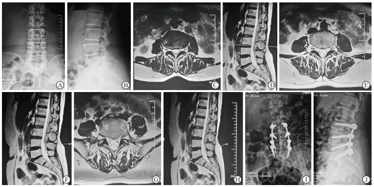 图 2 神经根型LDD影像学表现Fig. 2 Imaging of nerve root type of LDDA 65-year-old female patient was admitted with a 2-year history of bilateral lower limb pain and numbness. The pain radiated from both buttocks to the posterior thighs and the posterolateral calves. Physical examination revealed bilateral lower limb muscle strength of grade Ⅳ and hyperactive tendon reflexes. Preoperative anteroposterior (A) and lateral (B) X-ray images indicated degenerative changes in the lumbar spine. MRI scans at L3/4 (C, D), L4/5 (E, F), and L5/S1 (G, H) in anteroposterior and lateral views showed no significant signs of nerve compression, but a positive cauda equina sedimentation sign was noted. The patient was diagnosed with nerve root type of LDD and underwent modified transforaminal lumbar interbody fusion surgery. Postoperative anteroposterior (I) and lateral (J) X-rays showed good implant positioning. Postoperatively, the lower limb symptoms were significantly relieved, and the muscle strength improved. LDD: Lumbar degenerative disease; MRI: Magnetic resonance imaging.2.2 手术情况