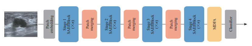 图 1 MECSA-Net的总体架构Fig. 1 Overall architecture of MECSA-NetPatch embedding denotes the process of splitting and embedding image patches, while patch merging refers to the hierarchical merging of image blocks. MECSA-Net: Mamba-enhanced convolutional and state-attention network; SAEffBlock: Shuffle-aware efficient block; MDFA: Multi-dilated fusion attention.在输入端,MECSA-Net通过patch embedding模块对原始图像进行切分与特征投影,保持空间结构的同时降低计算维度。随后输入4个特征提取阶段,每个阶段由多个自定义模块SAEffBlock组成,集成了轻量卷积与空间注意力机制,用于联合建模局部与全局特征关系。第1~3阶段输出后,均通过patch merging模块进行空间下采样与通道扩展,从而构建层次化特征表示。