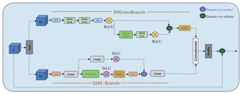 SAEffBlock: Shuffle-aware efficient block; EffConvBranch: Efficient convolution branch; BN: Batch normalization; Conv: Convolution; LN: Layer normalization; ReLU: Rectified linear unit; ECA: Efficient channel attention; DWConv: Depth-wise convolution; SiLU: Sigmoid linear unit; SS2D: 2D selective scan; SSM: State space modeling.
