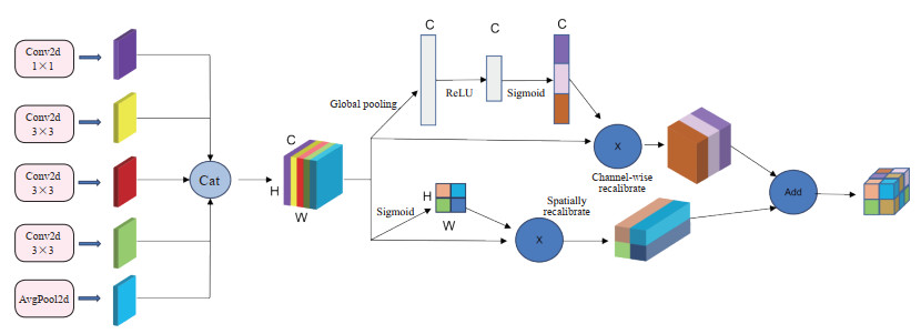 MDFA模型进一步引入联合注意力机制,对关键特征进行加权表达。通道注意力模块通过全局平均池化与1×1卷积生成通道权重,空间注意力模块通过1×1卷积与Sigmoid激活生成空间注意图。两者的输出经逐元素最大融合后,与原始融合特征进行逐元素乘法,增强对关键区域的响应能力,最后通过1×1卷积进行通道压缩,并辅以BatchNorm与ReLU激活,提升训练稳定性与特征一致性。