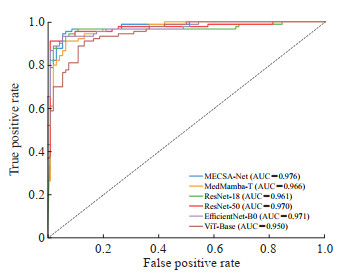 表 1 不同模型在TNBC与非TNBC分类任务中的性能比较Table 1 Performance comparison of different models in TNBC and non-TNBC classification tasksModel Accuracy/% (n/N) Precision/% (n/N) Recall/% (n/N) F1-score/% ResNet-18 89.4 (161/180) 84.5 (87/103) 96.7 (87/90) 90.2 ResNet-50 92.2 (166/180) 93.2 (82/88) 91.1 (82/90) 92.1 EfficientNet-B0 88.9 (160/180) 85.0 (85/100) 94.4 (85/90) 89.5 ViT-Base 66.7 (120/180) 70.3 (52/74) 57.8 (52/90) 63.4 MedMamba-T 88.9 (160/180) 84.3 (86/102) 95.6 (86/90) 89.6 MECSA-Net 93.9 (169/180) 94.4 (84/89) 93.3 (84/90) 93.9 TNBC: Triple-negative breast cancer; MECSA-Net: Mamba-enhanced convolutional and state-attention network. 2.2 ROC曲线与AUC评估