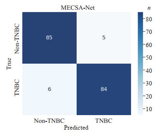 图 5展示了MECSA-Net在TNBC与非TNBC分类任务中的混淆矩阵结果。TNBC类别共90例样本,模型正确识别84例,误判6例为非TNBC;非TNBC类别同为90例样本,模型正确识别85例,误判5例为TNBC。结果表明,模型在两类样本上的识别能力均较高,分类结果未见明显偏倚,整体误判率较低,进一步说明MECSA-Net在不同类别间具备良好的区分能力和判别稳定性。