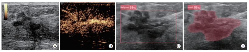 图 1 1例61岁女性患者乳腺恶性结节US、CEUS图像及AI辅助诊断结果(病理证实为浸润性乳腺癌)Fig. 1 US and CEUS images and AI-assisted diagnosis results of a malignant breast nodule in a 61-year-old female patient (invasive breast cancer confirmed by pathology)A: US revealed a hypoechoic mass at the 10 o'clock position of the right breast, measuring 28 mm×19 mm, with indistinct and spiculated margin, irregular shape, posterior acoustic shadowing; B: CEUS demonstrated heterogeneous hyperenhancement, the lesion size post-enhancement appeared larger compared to US, with indistinct margin after enhancement, the presence of nutrient vessels, and peripheral radial enhancement, and was diagnosed as "suspicious for malignancy"; C, D: The breast nodule was identified and assessed by AI software, which estimated a 93% probability of malignancy. US: Conventional ultrasonography; CEUS: Contrast-enhanced ultrasound; AI: Artificial intelligence.