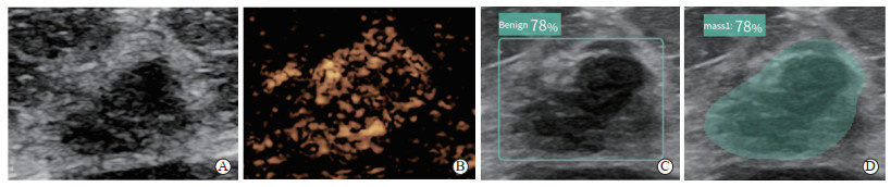 图 2 1例38岁女性患者乳腺良性结节US、CEUS图像及AI辅助诊断结果(病理证实为纤维腺瘤)