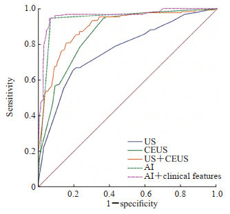 图 3 US、CEUS、US+CEUS、AI、AI+临床特征鉴别诊断乳腺良恶性结节的ROC曲线