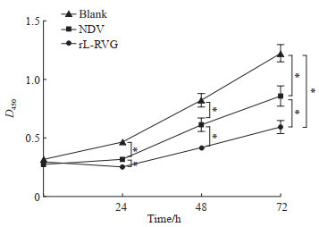 CCK-8结果显示,与对照组比较,rL-RVG组、NDV组细胞增殖能力受到抑制(均P<0.05),并且rL-RVG组细胞增殖能力的抑制程度较NDV组更为显著(P<0.05)。见图 1。