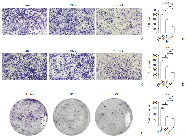 实验结果显示,与对照组相比,rL-RVG组、NDV组细胞迁移距离(图 2A、2B)、侵袭能力(图 2C、2D)及集落形成能力(图 2E、2F)均降低(均P<0.01);rL-RVG组细胞迁移距离、侵袭能力及集落形成能力比NDV组更低(均P<0.05)。