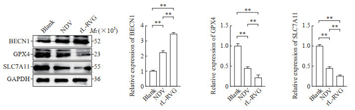 蛋白质印迹法检测结果显示,与对照组相比,rL-RVG、NDV组细胞中BECN1蛋白的表达升高(均P<0.01),并且rL-RVG组与NDV组相比BECN1蛋白表达更高(P<0.01);而GPX4、SLC7A11蛋白与对照组相比表达下降(均P<0.01),且rL-RVG组与NDV组相比GPX4、SLC7A11蛋白表达更低(均P<0.01)。见图 3。