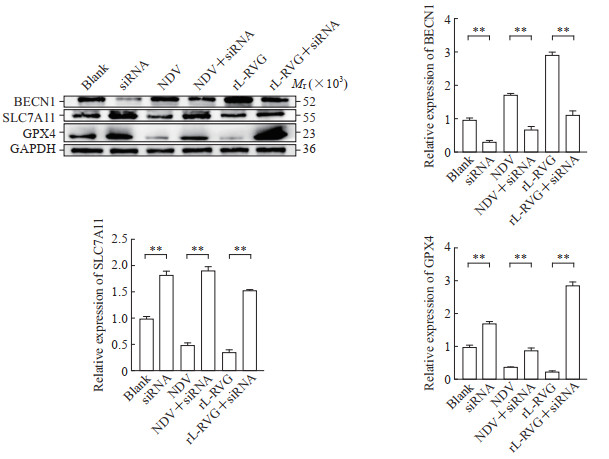 The protein expression was detected by Western blotting. **P<0.01. n = 3, x±s. BECN1: Beclin 1; siRNA: Small interfering RNA; SLC7A11: Solute carrier family 7 member 11; GPX4: Glutathione peroxidase 4; GAPDH: Glyceraldehyde-3-phosphate dehydrogenase; NDV: Newcastle disease virus; rL-RVG: Recombinant Newcastle disease virus rL-RVG.