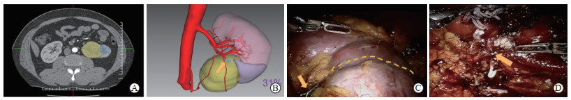 图 1 IQQA-3D导航系统在RAPN围手术期中的应用Fig. 1 Application of IQQA-3D navigation system in perioperative period of RAPNA: CTA of kidney (yellow part is T1b renal hilar tumor, and blue and yellow areas indicate the blood-supply regions of the tumor-domain branch arteries); B: IQQA-3D reconstruction, including the kidney, arterial blood supply and tumor, blue blood vessels pointed out by the arrow are tumor-domain branch arteries, and purple area at the lower pole of kidney is tumor-domain branch arteries providing part of renal blood supply, which accounted for 31% of renal blood supply; C: Intraoperative blockage of the branch arteries of the tumor (arrow), the tumor in the lower pole of the kidney is partially ischemic (dashed line), and the blood supply of the upper part of the kidney is good; D: Irreversible blockage of the branch arteries of the tumor indicated by the arrow. IQQA-3D: Intelligent/interactive qualitative and quantitative analysis of three-dimensional reconstruction technique; RAPN: Robot-assisted laparoscopic partial nephrectomy; CTA: Computed tomography angiography.所有患者经腹RAPN均由杨波主任医师主刀,使用达芬奇Si手术机器人系统(Intuitive Surgical公司,美国)完成手术。患者全身麻醉后,取侧卧折刀位。建立气腹,连接各机械臂置入手术器械,向内侧游离结肠,适当移动肝脏或脾脏,以暴露手术区域。在髂血管头侧腰大肌前方寻找输尿管,游离输尿管,继续沿腰肌向上至肾门部。分离出肾动脉、肾静脉,随后进一步精准解剖肾门部,暴露肾门结构及分支血管。然后切开肾周筋膜和脂肪囊,显露肾脏肿瘤,使用术中超声明确肿瘤边界并标记。
