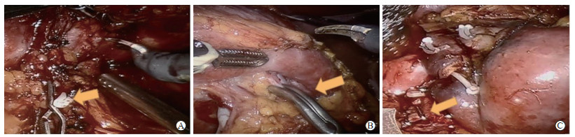 图 2 瘤域分支动脉血供的3种阻断方式Fig. 2 Three occlusion modalities for blood supply of tumor-domain branch arteriesA: Irreversible blockade of the tumor-domain branch arteries using Hem-o-lok (arrow); B: Reversible blockade of the tumor-domain branch arteries using spring clips (arrow); C: Emergency rescue blockade of the tumor-domain branch arteries using titanium clips (arrow).1.3 观察指标