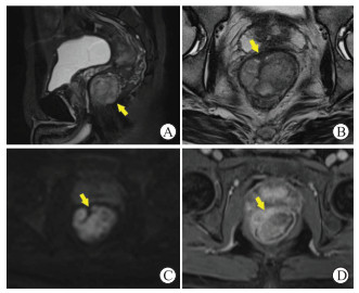 患者男,51岁,汉族,因“便血3个月”于2017年11月27日收入海军军医大学第一附属医院。既往阑尾切除3年,慢性乙型肝炎30年。体格检查:右下腹见瘢痕;肛门部外观正常,肛门指诊示肛门括约肌功能正常,后壁距肛缘3 cm处可触及一3 cm×3 cm肿物,质硬、隆起型、推之不动,陶氏腔未及肿物,指套退出有暗红色血迹。肠镜检查提示直肠近齿状线处肠腔内肿块,有灰褐色样色素沉着、表面糜烂、有溃疡、质硬,取3块活体组织送病理检查,病理结果提示少量恶性肿瘤细胞,考虑为恶性黑色素瘤。术前行直肠MRI平扫+增强检查,距肛缘3.5 cm处直肠下段齿状线上腔内见较大软组织肿块,边界清晰,长径约3.5 cm,最大层面约4.5 cm×3.6 cm,可见窄蒂样结构向内牵拉,肿块基底未见突破肌层,平扫T1加权成像(T1-weighted imaging,T1WI)表现为等低混杂信号,T2加权成像(T2-weighted imaging,T2WI)表现为等高混杂信号,弥散加权成像(diffusion weighted imaging,DWI)表现为明显高信号;系膜内可见3枚小淋巴结;增强扫描病灶呈不均匀明显强化,结合临床考虑直肠黑色素瘤(图 1)。