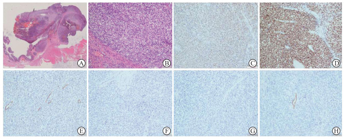 图 2 CCSLGT患者术后病理结果A:低倍镜下见肿瘤细胞排列成巢团状及片状,间质可见胶原增生,形成纤维状分隔(大切片,H-E染色,4×);B:高倍镜下见肿瘤细胞呈类圆形、多角形,部分胞质透亮,部分胞质嗜酸性,可见核仁(H-E染色,200×);C:肿瘤细胞表达S100(免疫组织化学染色,200×);D:肿瘤细胞表达SOX-10(免疫组织化学染色,200×);E:肿瘤细胞不表达平滑肌肌动蛋白(免疫组织化学染色,200×);F:肿瘤细胞不表达CD117(免疫组织化学染色,200×);G:肿瘤细胞不表达胃肠道间质瘤相关蛋白1(免疫组织化学染色,200×);H:肿瘤细胞不表达CD34(免疫组织化学染色,200×). CCSLGT:胃肠道透明细胞肉瘤样肿瘤;H-E:苏木精-伊红.2 讨论