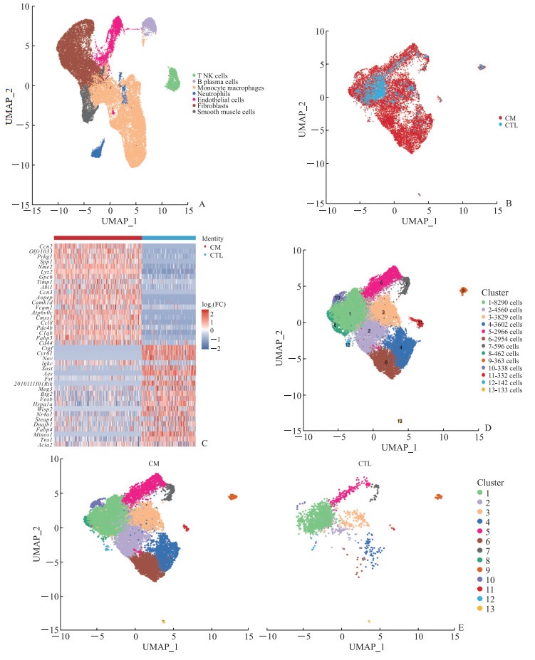 图 1 钙化条件下平滑肌细胞内聚类分析结果显示13型细胞簇A: Cluster analysis; B: Distribution of smooth muscle cells in the CTL group and CM group; C: Differential gene heatmap of smooth muscle cell expression under calcification; D: Unsupervised clustering identified 13 different groups in smooth muscle cells; E: Distribution of 13 subtypes of smooth muscle cells in the CTL group and CM group. UMAP: Uniform manifold approximation and projection; NK: Natural killer; CM: Calcified group; CTL: Control group; FC: Fold change.Fig. 1 Cluster analysis within smooth muscle cells under calcification conditions shows 13 cell clusters提取平滑肌细胞,相比于CTL组,CM组小鼠主动脉差异表达基因共有2 276个,其中平滑肌细胞收缩样表型标志性基因Acta2等基因下调,合成样表型标志性基因Cd44、Ccn3等基因同步上调(图 1B、1C)。