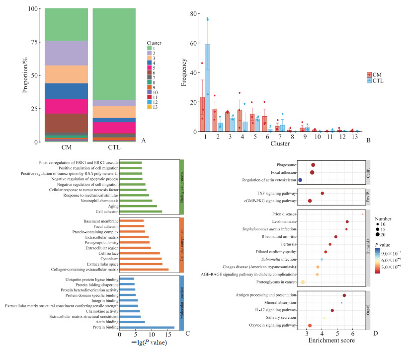 A, B: Unsupervised clustering identified 13 groups in smooth muscle cells. Compared with the CTL group, GPSM2+ smooth muscle cells (cluster 1) in the CM group were down-regulated significantly. n=3, x±s. C, D: GO (C) and KEGG (D) analyses of differentially expressed genes in GPSM2+ smooth muscle cells. GPSM2: G protein signaling modulator 2; CM: Calcified group; CTL: Control group; ERK: Extracellular signal-regulated kinase; CellP.: Cellular processes; TNF: Tumor necrosis factor; cGMP-PKG: Cyclic guanosine monophosphate-protein kinase G; EnvIP.: Environmental information processing; HumanD.: Human diseases; AGE: Advanced glycation end products; RAGE: Receptor for advanced glycation end products; IL: Interleukin; OrgaS.: Organismal systems; GO: Gene Ontology; KEGG: Kyoto Encyclopedia of Genes and Genomes.