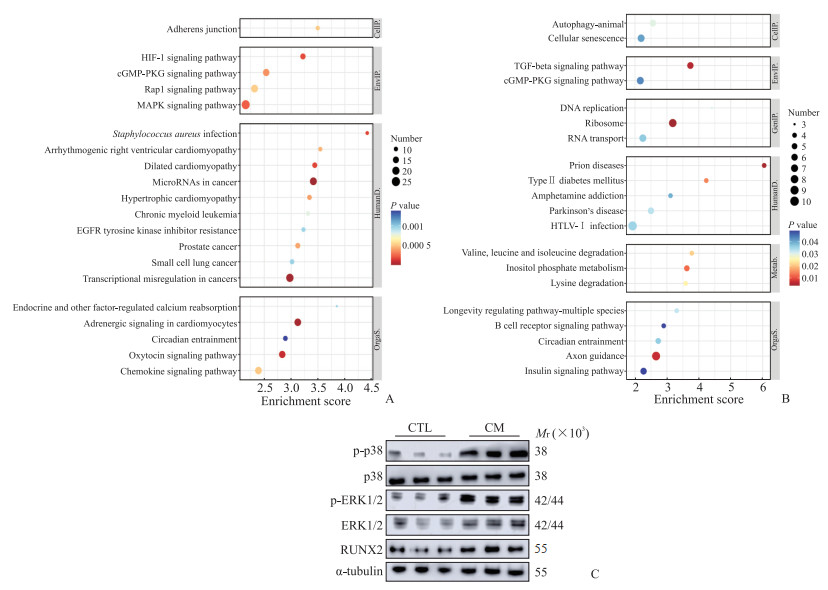 图 3 拟时序分析显示GPSM2+平滑肌细胞簇向S1PR3+细胞簇转化A: Pseudotime trajectory analysis showed the trend of changes in smooth muscle cells under calcification procedure; B: The changing trends of 13 different clusters of smooth muscle cells during calcification procedure; C: GPSM2+smooth muscle cell cluster switched to S1PR3+ smooth muscle cell cluster under calcification. GPSM2: G protein signaling modulator 2; S1PR3: Sphingosine-1-phosphate receptor 3.Fig. 3 Pseudotime trajectory shows the transformation of GPSM2+ smooth muscle cell cluster to S1PR3+ cell cluster对S1PR3+平滑肌细胞簇进行KEGG分析,结果显示MAPK通路、低氧诱导因子1通路、环鸟苷酸-蛋白激酶G信号通路上调,TGF-β信号通路、B细胞受体信号通路等下调(图 4A、4B)。蛋白质印迹法检测结果进一步验证了大鼠VSMC中MAPK通路在钙化刺激下上调,ERK1/2磷酸化水平(CTL组1.00±0.25,CM组2.15±0.53,P<0.05)、p38磷酸化水平(CTL组1.00±0.11,CM组1.39±0.08,P<0.05)及RUNX2表达水平(CTL组1.00±0.09,CM组1.39±0.12,P<0.05)均升高(图 4C)。