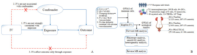 图 1 研究设计流程图A: Schematic diagram of core assumptions for Ⅳ analysis; B: MR study workflow. Ⅳ: Instrumental variable; GWAS: Genome Wide Association Study; MR: Mendelian randomization; LD: Linkage disequilibrium; cDC: Conventional dendritic cell; TBNK: Tumor-and blood-derived natural killer cell; Treg: Regulatory T cell; KCa: Kidney cancer; BCa: Bladder cancer; PCa: Prostate cancer.Fig. 1 Study design diagram1.2 数据来源