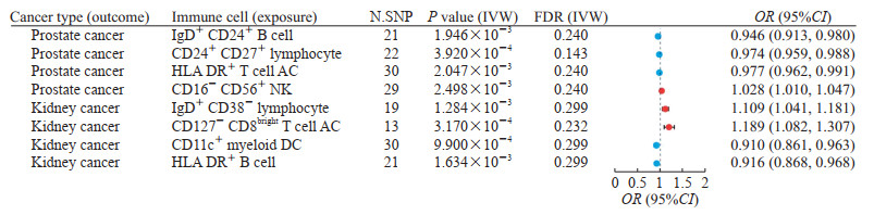 图 2 免疫细胞与泌尿系统恶性肿瘤风险之间因果关系的显著MR结果MR: Mendelian randomization; N.SNP: The number of SNP used as Ⅳ; IVW: Inverse-variance weighted; FDR: False discovery rate; Ig: Immunoglobulin; HLA DR: Human leukocyte antigen-DR isotype; AC: Absolute count; NK: Natural killer cell; DC: Dendritic cell; Ⅳ: Instrumental variable; SNP: Single nucleotide polymorphism; OR: Odds ratio; 95%CI: 95% confidence interval.Fig. 2 Significant MR results of causal effects between immune cells and urological malignancy risk表 1 免疫细胞与泌尿系统恶性肿瘤风险因果关系的水平多效性检验结果Table 1 Horizontal pleiotropy test results of causal effects between immune cells and urological malignancy riskCancer type (outcome) Immune cell (exposure) MR-Egger intercept test P value MR-PRESSO global test P value Prostate cancer IgD+CD24+ B cell 0.363 0.102 Prostate cancer CD24+CD27+ lymphocyte 0.851 0.859 Prostate cancer HLA DR+ T cell AC 0.940 0.674 Prostate cancer CD16-CD56+ NK 0.556 0.087 Kidney cancer IgD+CD38- lymphocyte 0.689 0.702 Kidney cancer CD127-CD8bright T cell AC 0.214 0.432 Kidney cancer CD11c+ myeloid DC 0.858 0.337 Kidney cancer HLA DR+ B cell 0.363 0.810 MR: Mendelian randomization; MR-PRESSO: MR pleiotropy residual sum and outlier; Ig: Immunoglobulin; HLA DR: Human leukocyte antigen-DR isotype; AC: Absolute count; NK: Natural killer cell; DC: Dendritic cell. 2.2 前列腺癌相关免疫细胞特性