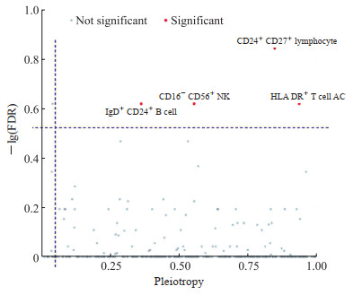 对731种免疫细胞与前列腺癌数据进行MR分析(结果见补充表 2、表 3),IVW法发现46种免疫细胞与前列腺癌风险相关,包括23个保护性免疫细胞表型和23个危险性表型(详见补充表 4)。进一步采用FDR法对IVW法的P值进行多重校正,发现4种免疫细胞表型与前列腺癌风险有统计学关联(图 3),包括3个保护性特征和1个危险性特征:IgD+CD24+B细胞水平、CD24+CD27+淋巴细胞水平和人类白细胞抗原(human leukocyte antigen,HLA)DR+ T细胞绝对细胞计数水平对预防前列腺癌具有保护作用,而CD16-CD56+ NK水平与前列腺癌风险呈正相关(均FDR<0.3,图 2)。MR-Egger截距检验和MR-PRESSO全局检验均未观察到显著的多效性(均P>0.05,表 1),表明结果可靠。