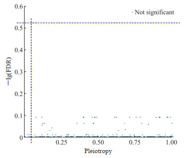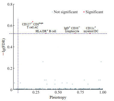 首先对731种免疫细胞与膀胱癌数据进行MR分析(结果见补充表 8、表 9),IVW方法发现38种免疫细胞与膀胱癌风险相关,包括18个保护性特征和20个危险性特征(详见补充表 10)。用FDR法对IVW方法的P值进行多重校正,结果未发现免疫细胞表型与膀胱癌风险有统计学关联(图 5)。