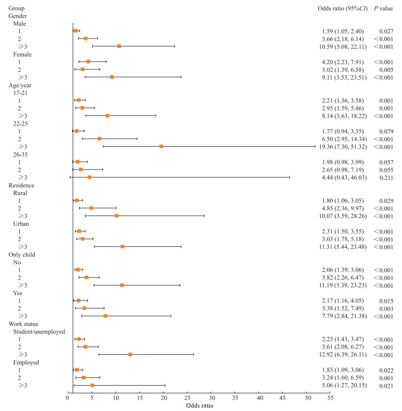 由图 2、图 3可见,对年龄为26~35岁组及工作状态为工作者的青年人,在调整了年龄、性别、民族、工作状态、是否为独生子女、居住地、收入状况、饮酒、吸烟和睡眠满意度等协变量后未发现躯体忽视、躯体虐待和性虐待暴露与抑郁症状的关联(均P>0.05),但情感忽视、情感虐待暴露与抑郁症状有关联(均P<0.01)。在探究ACE各子类别与抑郁症状的关联时发现,不同性别亚组引发抑郁症状风险最高的均为情感虐待(男:OR=10.22;女:OR=5.78);从年龄亚组看,17~21岁组引发抑郁症状风险最高的是躯体虐待(OR=6.12),22~25岁组、26~35岁组的均是情感虐待(OR=15.43、14.07);从居住地看,无论居住在农村还是城市引发抑郁症状风险最高的也均为情感虐待(OR=14.18、6.86);非独生子女在情感虐待中的OR最高(OR=13.54),而独生子女则在躯体虐待中显示出最高的OR(OR=6.18);学生或非工作者群体在躯体虐待中的OR最高(OR=9.07),而工作者群体在情感虐待中的OR最高(OR=7.18)。