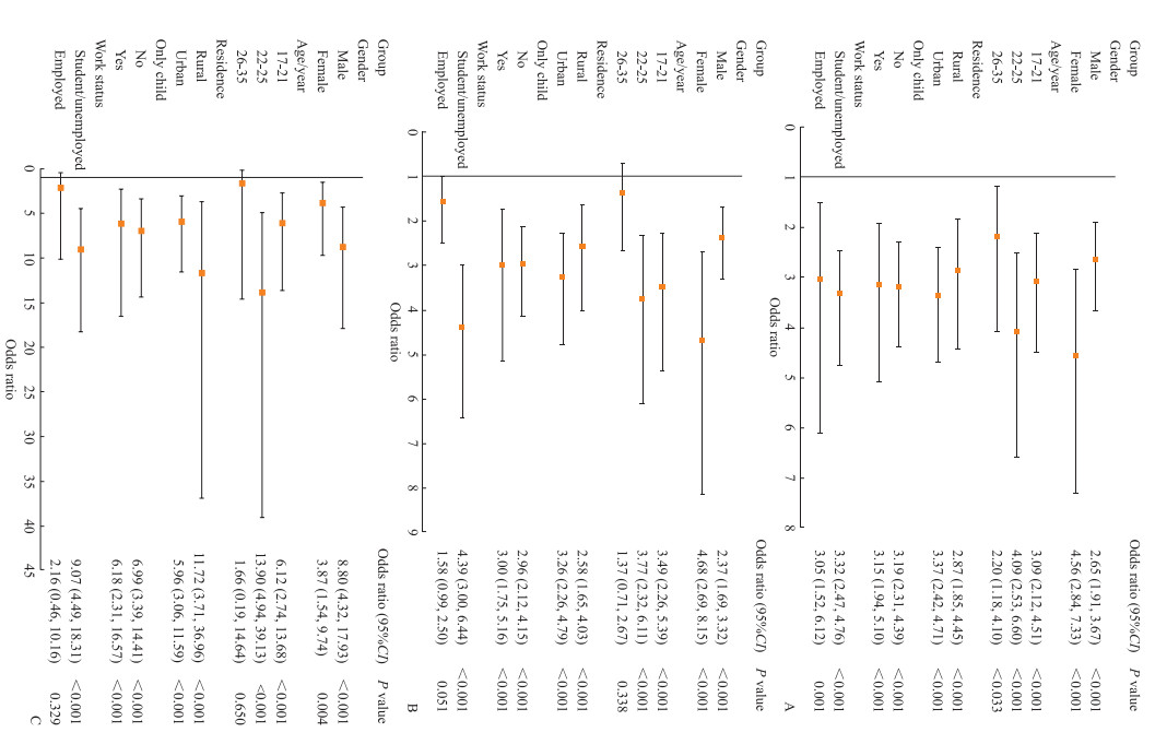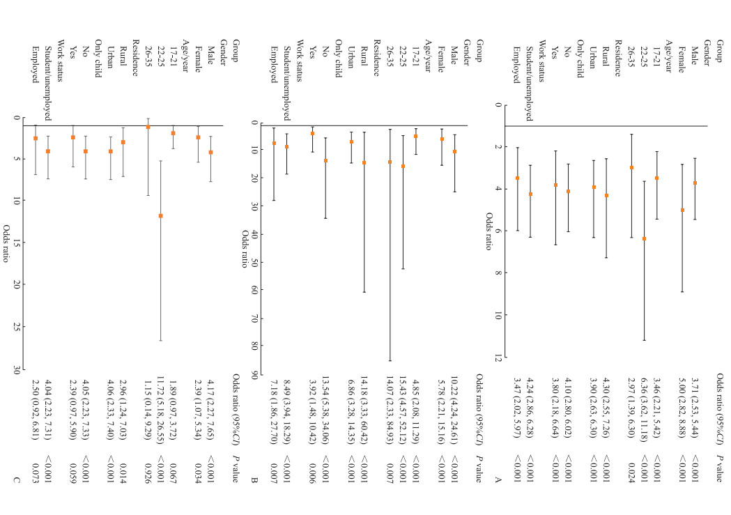 图 3 不同亚组中情感忽视暴露(A)、情感虐待暴露(B)、性虐待暴露(C)对抑郁症状影响的多因素logistic回归分析