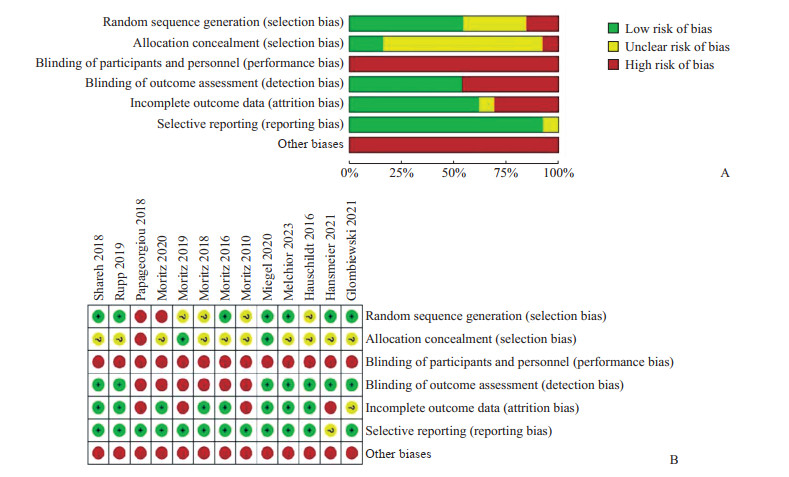 纳入的13篇文献[18-19, 23-33]根据Cochrane偏倚风险评估方法,利用RevMan 5.3软件进行风险偏倚评估,结果见图 2。纳入文献总体质量为中等,图 2A、2B均显示纳入文献主要高风险领域是盲法缺失及随机化的不透明,会导致干预结果的高估以及无法排除选择偏倚;而研究的失访及报告偏倚风险较低说明纳入文献的数据完整性较好,结果报告的完整性较高。