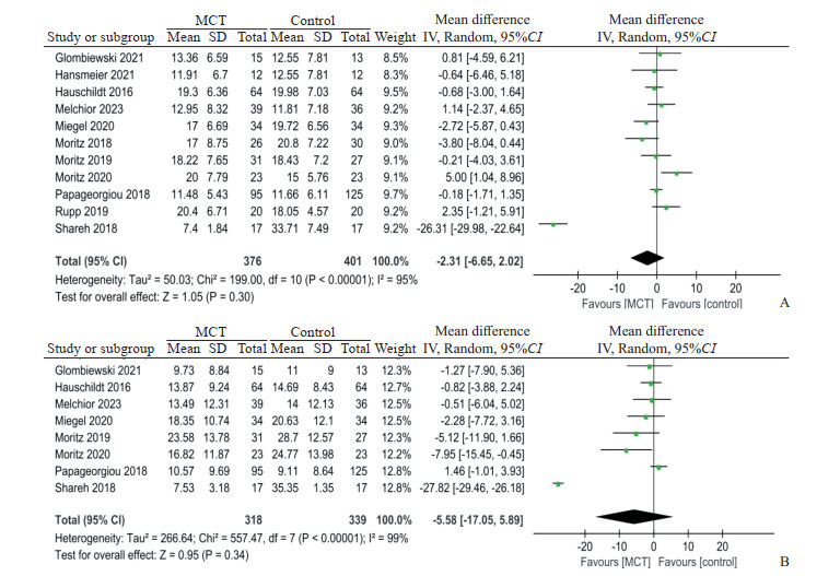 A: Yale-Brown obsessive compulsive scale score; B: Beck depression inventory score. MCT: Metacognitive therapy; SD: Standard deviation; IV: Inverse variance; 95%CI: 95% confidence interval.