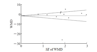 13篇文献中有2篇[23-24]仅给予基线时具体数据,对于干预治疗后的数据仅有图表,无法提取具体的数据,故对剩余11篇文献[18-19, 25-33]的主要结局指标的Y-BOCS总分进行分析。计算统计量得出纳入的文献间异质性较大(P<0.01,I2=95%),采用随机效应模型进行效应量的合并,meta分析结果显示,经过MCT治疗后患者强迫症状改善的效果与对照组相当,差异无统计学意义(MD=-2.31,95%CI -6.65~2.02,P=0.30),见图 3A。对这11篇文献进行发表偏倚分析,Begg’s检验未见明显偏倚(P=0.436),见图 4。因结果存在较大异质性,使用Stata软件对结果进行敏感性分析,结果表明meta分析的结果稳定,未见某项单独的研究对整体的合并效应量产生了决定性的或过大的影响,见图 5。