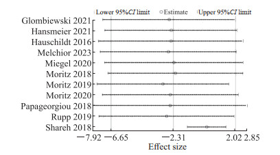 表 1 纳入文献的基本特征Table 1 Basic characteristics of included studiesStudy Sample size, n Age/year, x±s Female, n Intervention method Treatment cycle MCT Control MCT Control MCT Control MCT Control Moritz, et al 2010 [23] 43 43 34.95±11.87 34.09±9.41 27 31 myMCT BC 4 weeks Moritz, et al 2016 [24] 32 29 24.72±6.65 25.41±5.97 12 18 myMCT BC 6 weeks Hauschildt, et al 2016 [19] 64 64 38.41±11.61 39.64±9.88 43 43 myMCT Psy-ed 4 weeks Shareh 2018 [25] 17 17 32.06±8.59 31.14±9.21 8 9 MCT+HRT BC 3 weeks Moritz, et al 2018 [26] 35 35 38.17±11.96 39.34±14.52 25 29 myMCT BC 6 weeks Papageorgiou, et al 2018 [27] 95 125 31.76±9.91 34.98±9.86 45 66 MCT ERP 4 months Rupp, et al 2019 [28] 22 21 31.59±11.73 30.43±8.42 13 12 MCT BC 4 weeks Moritz, et al 2019 [30] 84 76 29.27±7.55 28.97±8.69 36 34 myMCT BC 6 weeks Moritz, et al 2020 [29] 41 38 38.02±11.71 44.69±15.39 26 18 MCT CVT 6 weeks Miegel, et al 2020 [18] 39 40 38.05±10.4 40.1±13.13 20 21 MCT CVT 8 weeks Glombiewski, et al 2021 [31] 19 18 30.2±10.2 31.5±11.4 11 13 MCT ERP 3 months Hansmeier, et al 2021 [32] 12 12 32.3±11.4 28.7±9.4 6 9 MCT ERP 3 months Melchior, et al 2023 [33] 45 45 30.8±10.2 31.6±9.8 29 26 MCT ERP 6 months MCT: Metacognitive therapy; myMCT: My metacognitive training; BC: Blank control; Psy-ed: Psychoeducation; HRT: Habit reversal training; ERP: Exposure and response prevention; CVT: Conventional treatment. 2.4 效应量综合