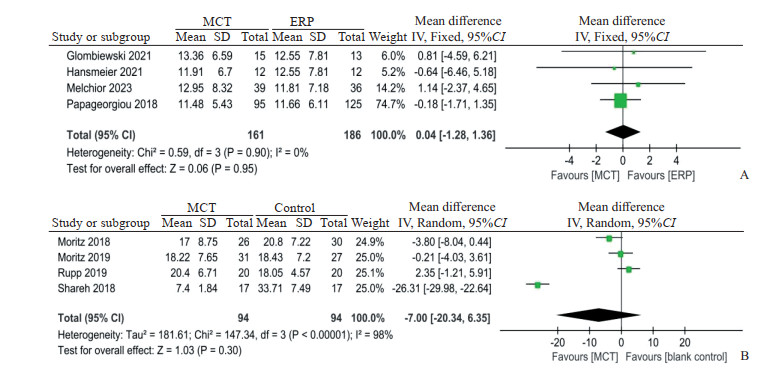 A: Compared to ERP group; B: Compared to blank control group. MCT: Metacognitive therapy; ERP: Exposure and response prevention; SD: Standard deviation; IV: Inverse variance; 95%CI: 95% confidence interval.