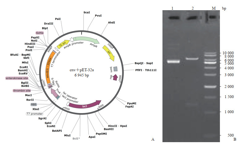A: Diagram of the pET-32a-env recombinant plasmid; B: Electrophoresis identification results. 1: pET-32a-env plasmid; 2: pET-32a-env plasmid double digestion product; M: DNA marker. env: Envelope.