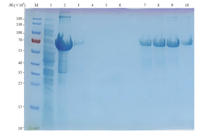 M: Protein marker; 1: Supernatant after lysis of pET-32a-env recombinant bacteria; 2: Pellet after lysis of pET-32a-env recombinant bacteria; 3-6: Wash fractions from 4 rounds of column purification of denatured inclusion body proteins; 7-10: Elution fractions from 4 rounds of column purification of denatured inclusion body proteins. SDS-PAGE: Sodium dodecylsulfate-polyacrylamide gel electrophoresis; env: Envelope.