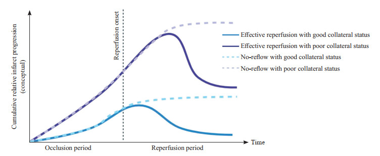 During the vessel occlusion period, good collateral circulation slows the progression of infarction, whereas poor collateral circulation leads to more rapid infarct expansion. The black dashed line indicates the time point of vascular recanalization. After recanalization, tissue perfusion outcomes may diverge into effective microvascular reperfusion or no-reflow. In the case of effective reperfusion, infarct progression tends to stabilize under good collateral conditions, whereas patients with poor collateral status may still experience ongoing tissue injury. In contrast, under no-reflow, ischemic progression continues despite angiographic evidence of successful recanalization, and the collateral status further influences the progression and the final extent of tissue damage.
