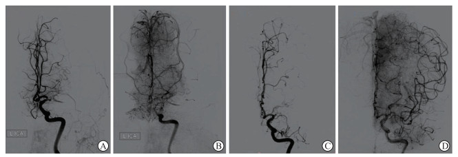 图 2 DSA显示不同侧支代偿状态的代表性示例Fig. 2 Representative examples of collateral status assessed by DSAImages from the Neurovascular Center of The First Affiliated Hospital of Naval Medical University. Under left internal carotid artery (LICA) angiography, sparse cortical vessel visualization and limited distal branch filling suggest poor leptomeningeal collateral circulation (A, B). In contrast, a dense cortical vascular network with broad coverage and evidence of retrograde filling suggests good collateral status (C, D). The lower region of each image corresponds to the internal carotid artery trunk, while the upper region represents the cortical vascular territory, illustrating that DSA-based assessment primarily relies on the density and extent of cortical vessel opacification for qualitative evaluation of collateral status. DSA: Digital subtraction angiography.3.1.3 MRA与CTP参数