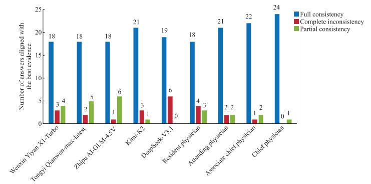 本研究结果显示,临床医生的最佳证据建议依从性随职称提升显著增强,主任医师的完全符合率最高(96%),无完全不符合的情况发生;同时,随着职称的提升,不完全符合的比例并未增加,表明高年资医生丰富的临床经验有助于避免不完全符合最佳证据建议的情况发生。高年资医生(副主任/主任医师)通过大量的临床实践,能更加准确地理解最佳证据建议的适用边界和例外情况,从而做出既符合最佳证据建议原则又契合个体情境的判断[12]。此外,LLM的整体表现介于住院医师与主治医师之间,但均未达到高年资医生的水平。这一差异可能源于临床医生实践经验的积累,低年资医生的临床经验相对有限,而高年资医生经过长期实践,临床经验丰富,这种经验是当前数据驱动的LLM难以完全模拟的。