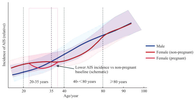 图 1 不同性别人群AIS发病率的年龄依赖性变化示意图Fig. 1 Schematic illustration of age-specific changes in incidence of AIS by sex and genderThe incidence is slightly higher in females during early adulthood (20-35 years), whereas males show higher incidence during midlife and early older age (approximately 40-<80 years). At advanced ages (≥80 years), the sex and gender difference gradually diminishes. The shaded areas indicate the uncertainty of the trend (conceptual confidence interval). The pink shaded region indicates the pregnancy period, representing a transient female-specific life stage during which the incidence is depicted as slightly lower relative to the non-pregnant baseline. This element is included for conceptual illustration only and does not represent a quantitative estimate or imply causal inference. AIS: Acute ischemic stroke.多国卒中登记研究表明,女性患者通常起病年龄更大、发病前神经功能状态较差,且基线神经功能缺损更严重。但在校正年龄及主要合并症后,女性接受静脉溶栓和机械取栓的比例与男性总体相当,在部分研究中甚至略高[15-16, 22-24]。随着卒中救治体系的完善和再灌注治疗策略的普及,两性在治疗可及性和早期临床结局方面的差距正在逐渐缩小[8]。