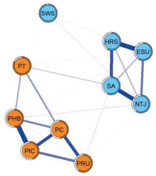 表 1 脑卒中高危人群的健康信念和SPDBI得分及联合网络中各节点的关联强度Table 1 Scores of health belief and SPDBI among high-risk population for stroke and correlation strength of each node in joint networkn=449 Variable Score, x±s Weight of correlation strength PHB PIC PC PRU PT SWS NTJ SA HRS ESU Health belief 159.8±33.4 PHB 33.8±9.2 0.00 PIC 22.8±5.6 0.49 0.00 PC 20.0±5.1 0.22 0.35 0.00 PRU 47.3±10.9 0.05 0.25 0.35 0.00 PT 35.8±8.6 0.14 0.02 0.16 0.04 0.00 SPDBI 70.6±21.7 SWS 25.9±10.1 0.02 0.01 0.02 0.00 0.04 0.00 NTJ 19.0±8.8 -0.07 0.00 -0.01 -0.03 0.00 0.06 0.00 SA 9.7±4.3 0.00 0.00 0.00 -0.07 0.09 0.00 0.44 0.00 HRS 8.4±3.5 0.00 0.00 0.00 0.03 0.01 0.01 0.13 0.33 0.00 ESU 7.7±3.3 -0.04 0.00 0.00 0.00 -0.04 0.04 0.23 0.13 0.46 0.00 SPDBI: Stroke pre-hospital delay behavioral intention; PHB: Personal health belief; PIC: Perceived implementation capability; PC: Perceived control; PRU: Perceived resource utilization; PT: Perceived threat; SWS: Stroke warning sign; NTJ: Non-treatment justification; SA: Symptom attribution; HRS: Habitual response style; ESU: Emergency system use. 2.3 网络分析结果