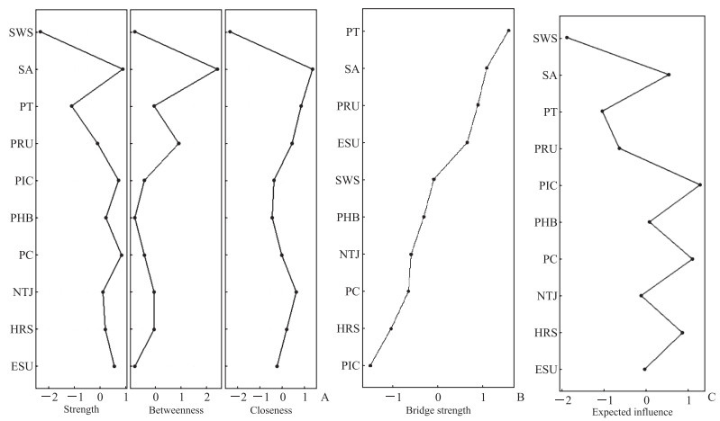 图 2 网络节点中心性(A)、桥梁强度(B)和预期影响(C)分析结果